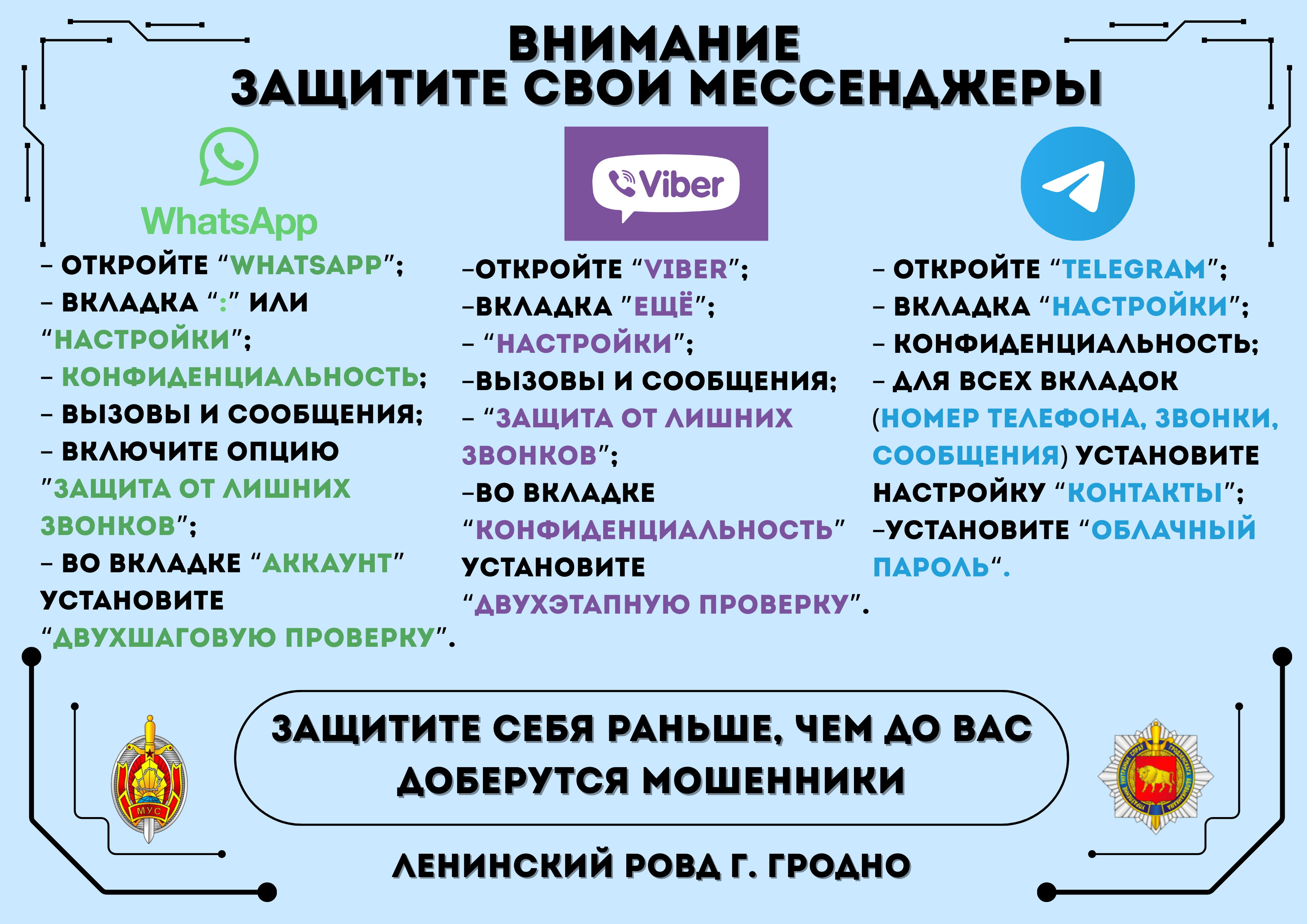 Мошенники постоянно совершенствуют схемы обмана, чтобы заполучить ваши деньги. Для связи с Вами, кроме интернет-звонков в мессенджерах Viber, Telegram, WhatsApp и иных, они могут использовать стационарную телефонную и мобильную связь, а также интернет-видеосвязь. Чаще всего мошенники представляются сотрудниками правоохранительных органов, работниками операторов сотовой связи, государственных или банковских организаций, реже – вашим родственником или руководителем, специалистом брокером или трейдером криптобиржи.
